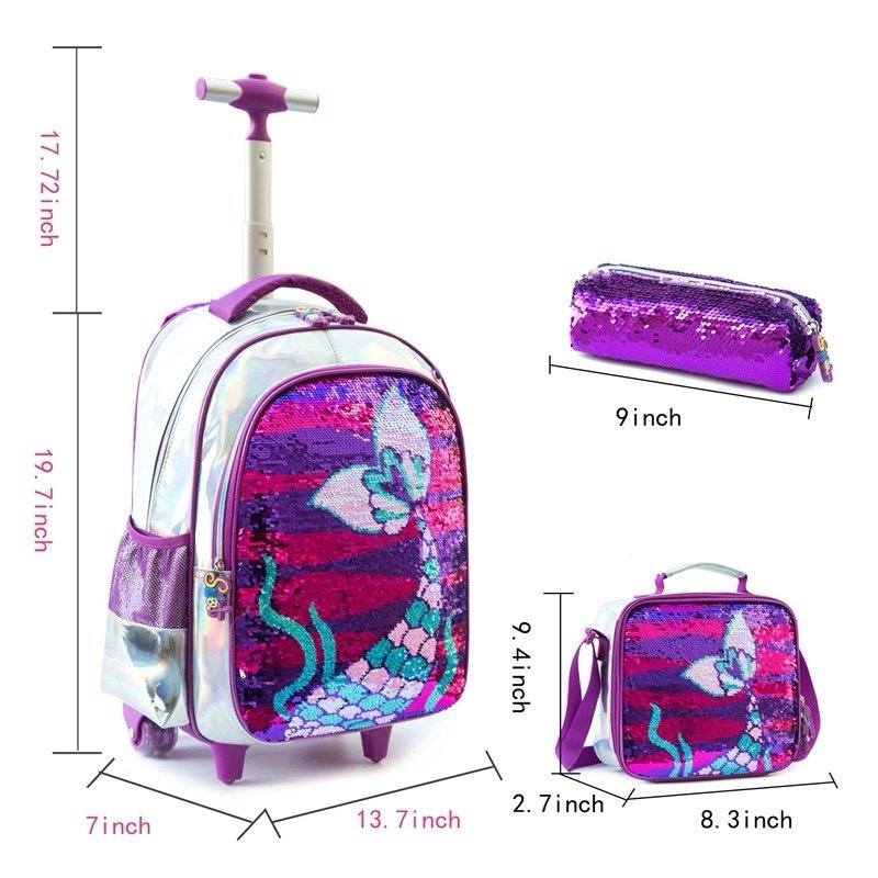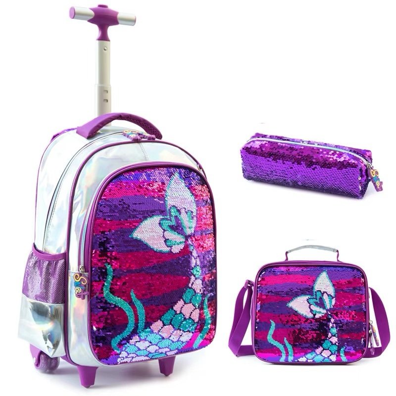 Mochila con rueda (grande), merendero y cartuchera.