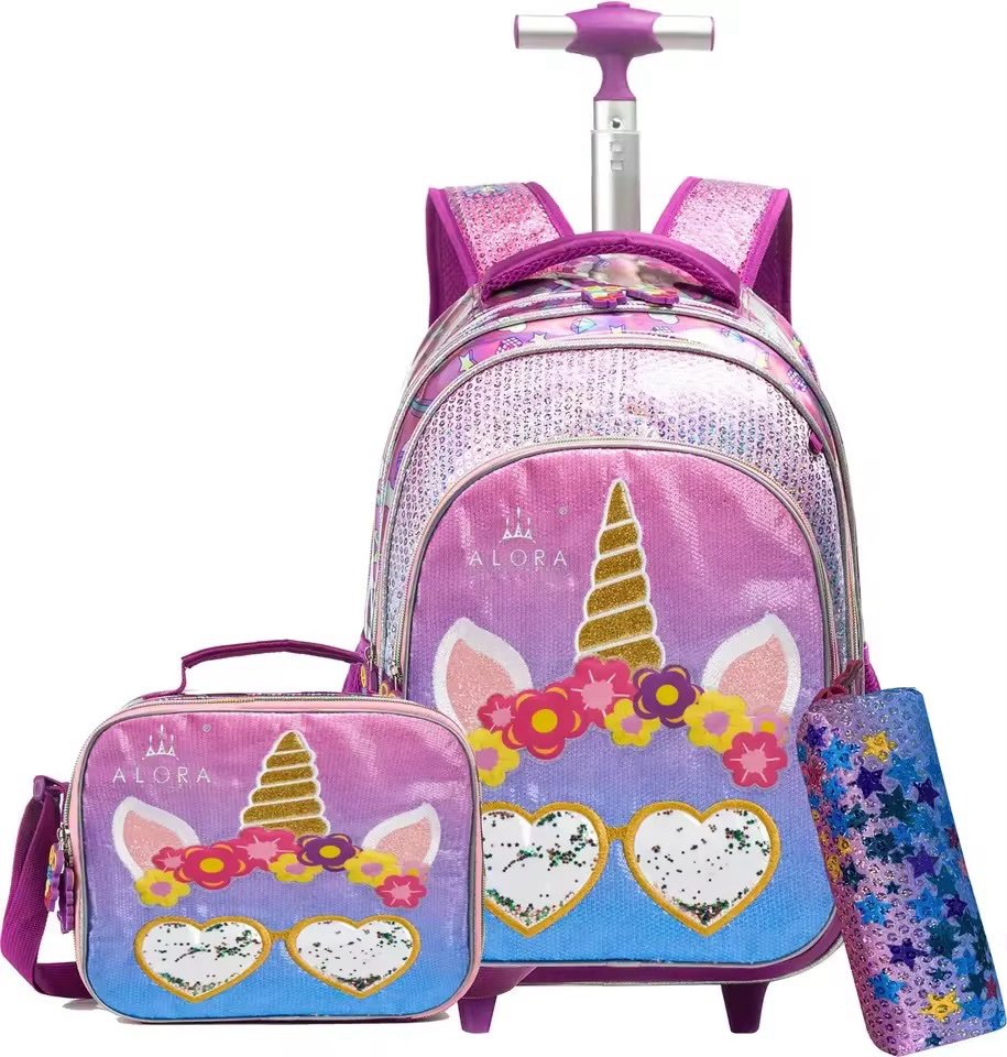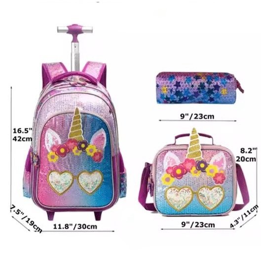 Mochila con rueda (grande), merendero y cartuchera.